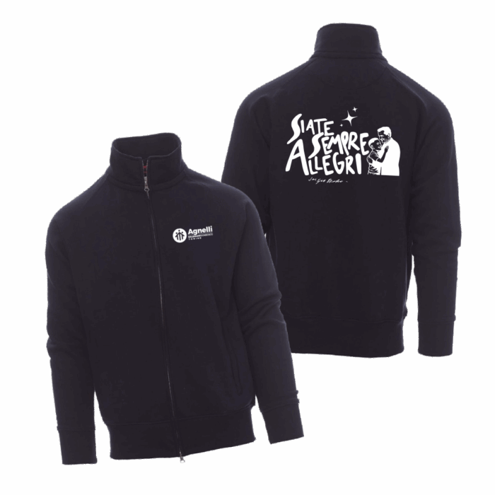 Acquista la felpa per l’Istituto Agnelli, disponibile in questa colorazione blu navy sia per uomo che per donna. La felpa presenta sul fronte la stampa di una grafica con la scritta che recita “Siate Sempre Allegri” e sul retro, all’altezza del collo, il logo dell’Istituto Agnelli.