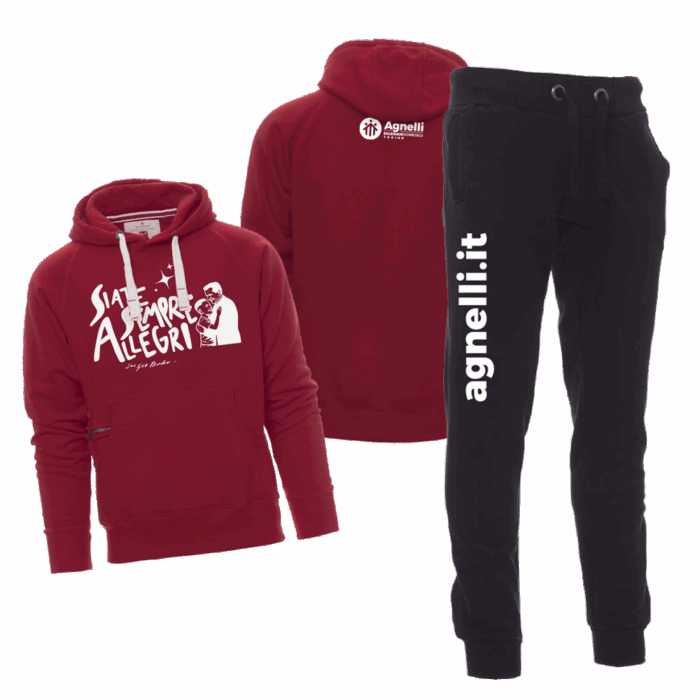 Acquista il set tuta dell’Istituto Agnelli, comoda e calda per le stagioni più fresche. Disponibile in questa versione con felpa rossa e pantalone nero, sia per uomo che per donna. La felpa presenta sul fronte la stampa di una grafica con la scritta che recita “Siate Sempre Allegri” e sul retro, all’altezza del collo, il logo dell’Istituto Agnelli. Il pantalone ha la stampa del sito agnelli.it sulla gamba destra.