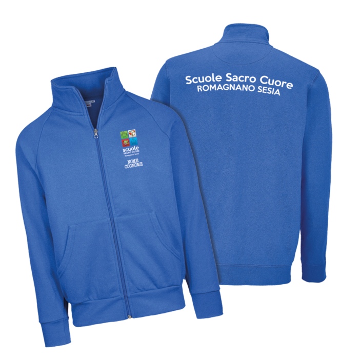 La scuola Sacro Cuore Romagnano Sesia propone la felpa felpata bambino in questa colorazione blu con il logo della scuola sul lato cuore e in nome della scuola sulla schiena. Sul lato cuore inoltre è possibile personalizzare la felpa felpata con il nome del bambino.